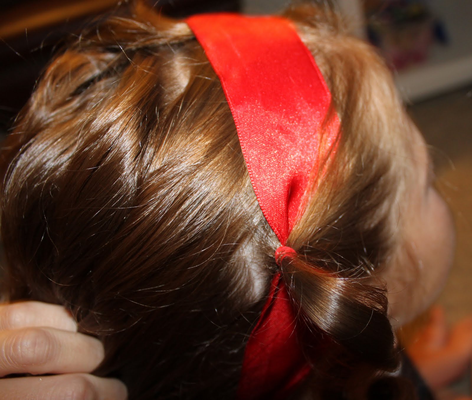 She asked for a ribbon headband. Since we all know these don't stay in all day by themselves. I took a small amount of hair just above each ear and singled it out. Then place the ribbon behind that hair. Pull the small amount of hair that was left out across the ribbon and take another small amount of hair on the opposite side of the ribbon and secure with an elastic. (SHOWN BELOW).