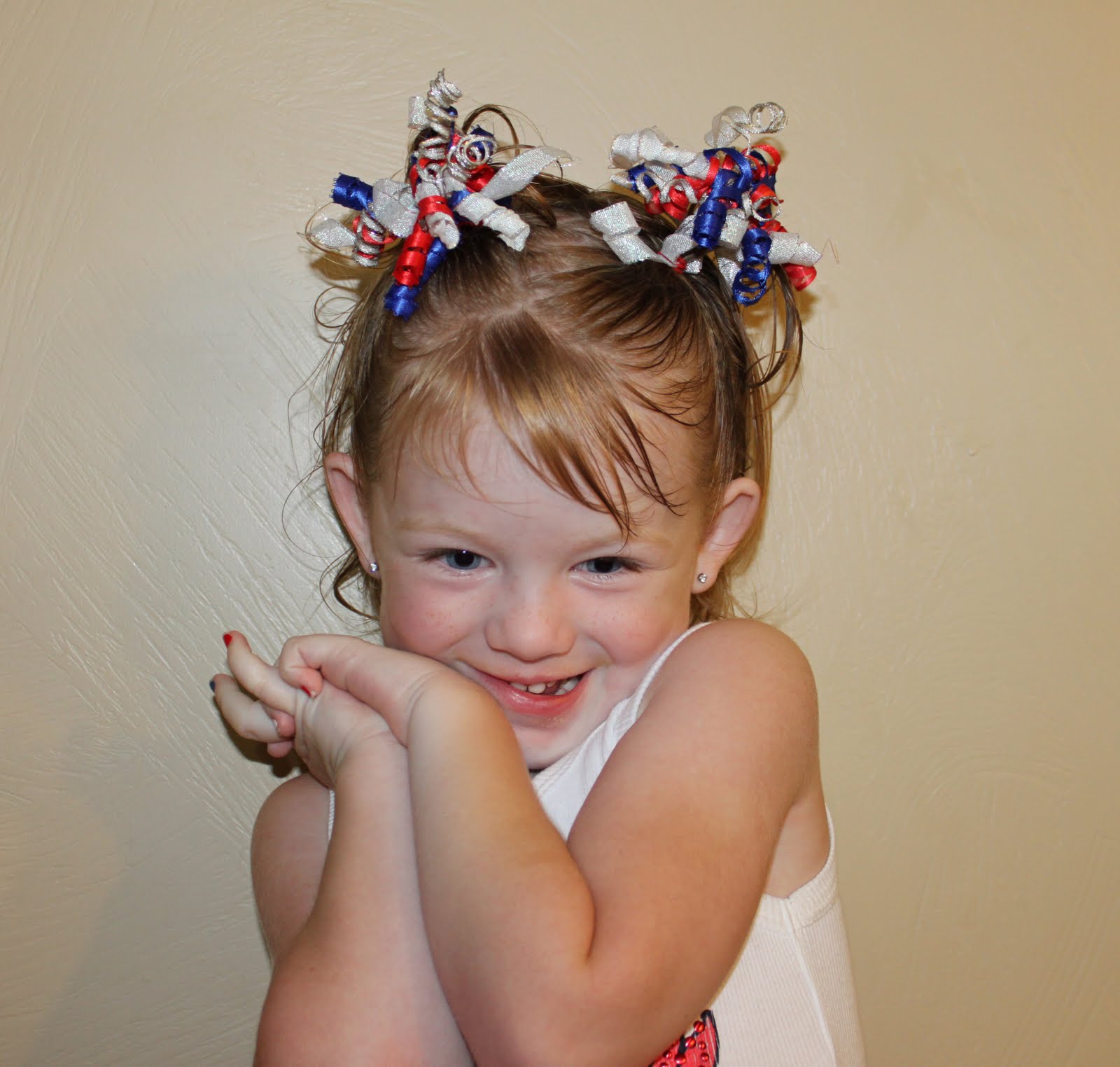 I made a zig zag part and then put her hair into pigtails The hair accessories were secured with the fun sidewinders http://www.hairholders.com/ The sidewinders made the accessories stand up. I was going for the fire work affect with her hair.